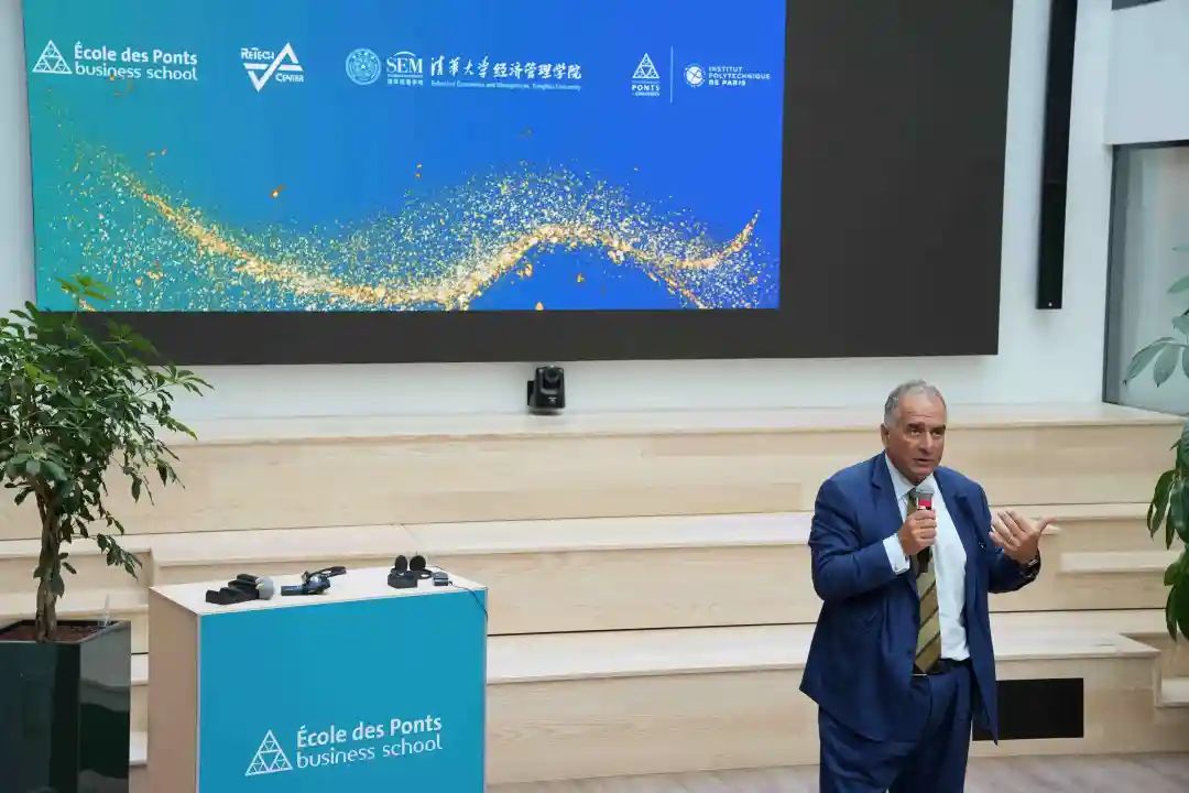 路桥商学院、巴黎高等商学院联袂授课环节,巴黎高等商学院院长埃洛伊奇·佩拉奇(Eloïc Peyrache)与法国国立路桥大学商学院院长阿龙·罗森(Alon Rozen)分别发表精彩致辞。他们的研究和教学领域非常多样化,包括创新、商业模式、全球化、系统思考、商业规划等,为世界各大企业培养了大批优秀的管理者和领导者。